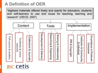 The document proposes a framework for understanding and evaluating the impact of open educational resources (OER) based on the Zachman Framework. It defines OER and provides examples of OER programs. It then adapts the Zachman Framework's six perspectives to the context of OER, covering motivation, content, processes, locations, people, and time. This adapted framework can be used to assess OER programs and impact by considering the perspectives of planners, owners, designers, and users.