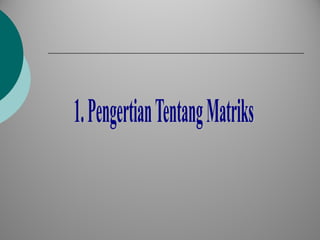 Dokumen ini menjelaskan pengertian dan konsep dasar matriks, termasuk elemen, ukuran, jenis-jenis matriks, dan operasi matriks seperti penjumlahan, pengurangan, dan perkalian. Terdapat penjelasan tentang matriks bujur sangkar, matriks segitiga, dan sifat-sifat operasional matriks. Informasi ini adalah dasar untuk memahami bagaimana matriks berfungsi dalam matematika dan aplikasinya.