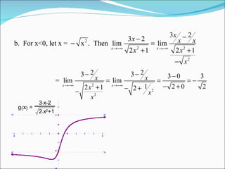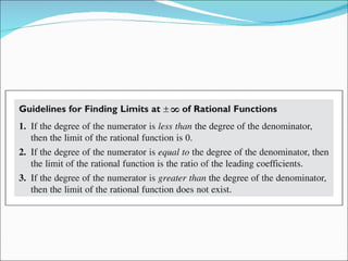 The document discusses determining limits at infinity for functions. It explains that limits at infinity occur as the variable increases or decreases without bound. The graph of a function may approach horizontal asymptotes or cross them as the variable approaches positive or negative infinity. It also discusses using trigonometric squeeze theorem to determine limits at infinity and how rational functions have the same horizontal asymptotes at positive and negative infinity, while other functions may have different behaviors.
