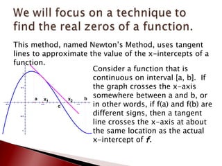 This document summarizes Newton's method, an iterative process for finding approximations of the zeroes of a function. It works by using tangent lines to get better approximations with each iteration. The method starts with an initial guess x1 and calculates successive approximations x2, x3, etc. by finding the x-intercept of the tangent line at the previous point. If the approximations converge to a limit, Newton's method has found a zero of the function. The document provides examples of functions where Newton's method does and does not converge.