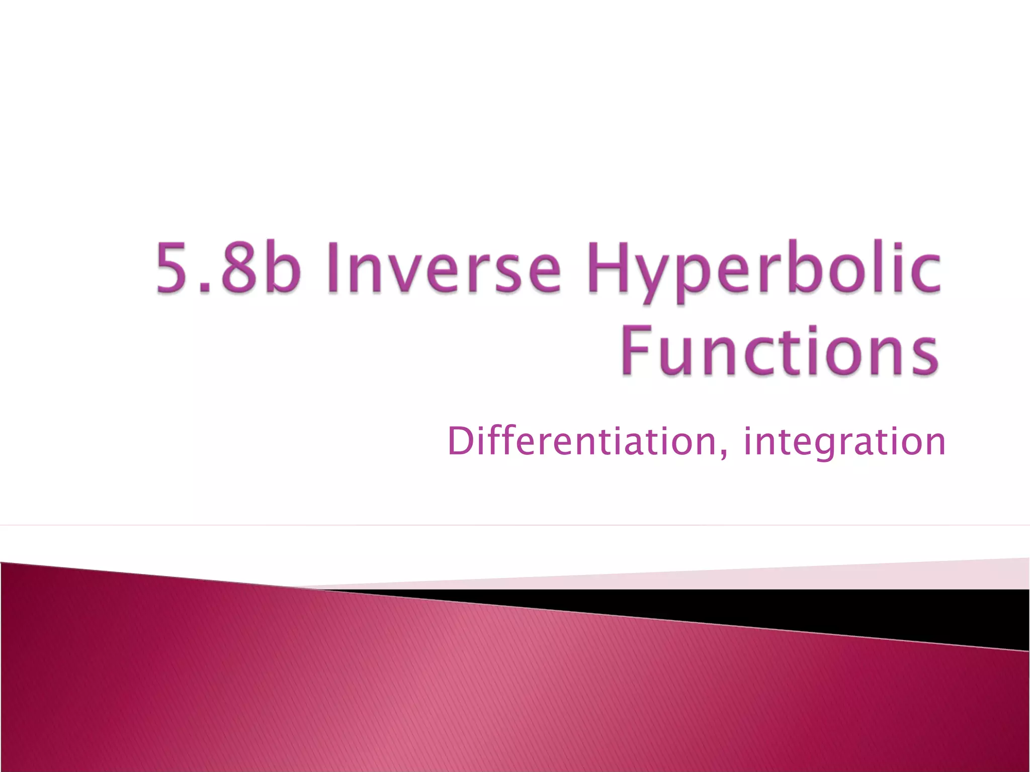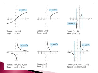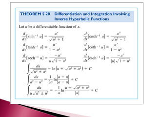 The document discusses hyperbolic functions and their inverses. It explains that unlike trigonometric functions, hyperbolic functions are not periodic. It also discusses using hyperbolic functions to define pursuit curves called tractrices. As an example, if a boat is 20 feet from a dock and pulled 5 feet by a rope, the person holding the rope must walk over 26 feet.
