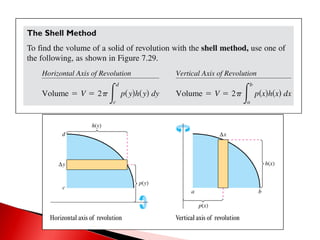 The document discusses using the shell method to find the volume of solids of revolution. The shell method uses cylindrical shells to calculate volume, whereas the disk method uses disks. It is best to use the shell method when the representative rectangle forming each shell layer is parallel to the axis of rotation, as this allows identifying the radius using the correct variable in the integral. The disk method is best when the rectangle is perpendicular to the axis of rotation. Examples are provided to illustrate setting up integrals for both methods.