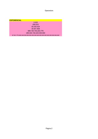 Operardors Pàgina 2 EXPONENCIAL 2.025 658.503 45.435.424 35.831.808 899.194.740.203.776 285.544.154.243.030.000 87.501.775.260.248.300.000.000.000.000.000.000.000.000.000.000.000.000.000