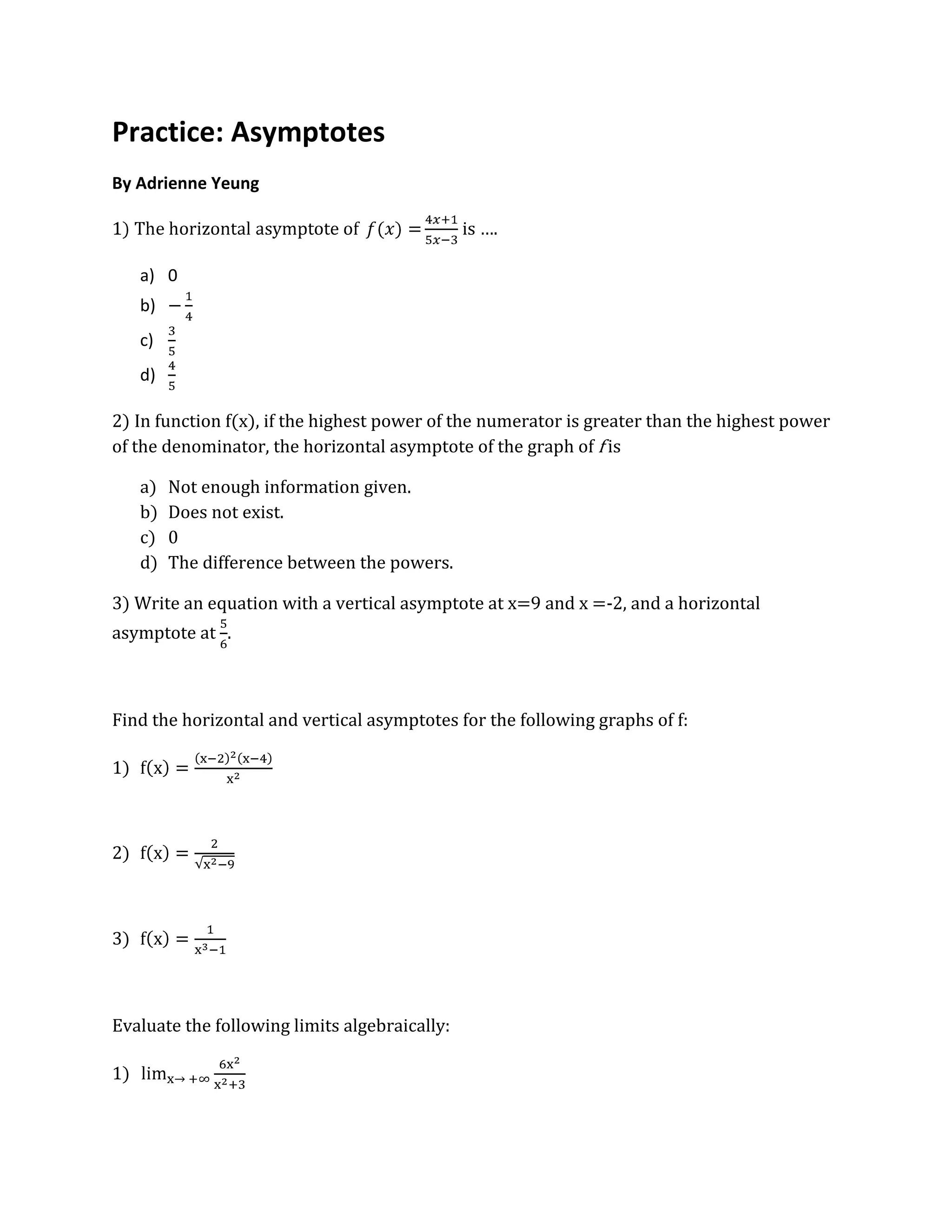 This document discusses practice problems on asymptotes. It includes questions about identifying horizontal and vertical asymptotes from graphs and equations. It also has questions about evaluating limits algebraically to find asymptotes and writing equations with given vertical and horizontal asymptotes.