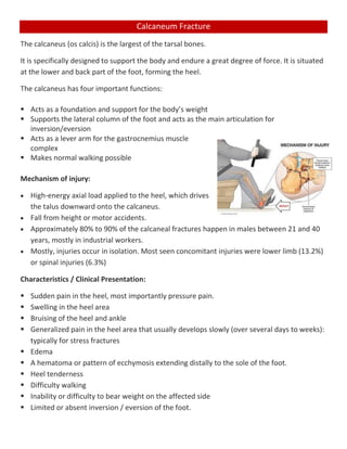 The calcaneus is the largest tarsal bone in the foot and acts as the foundation and lever for the foot and lower leg. Calcaneus fractures most commonly occur from high-energy impacts to the heel that drive the talus down onto the calcaneus. They present with pain and swelling in the heel and difficulty walking. Treatment depends on the fracture type but often involves initial immobilization, physical therapy to regain range of motion and strength, and progression to full weight bearing over several months to allow healing. Surgical fixation may be required for displaced fractures to realign the bones.