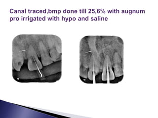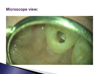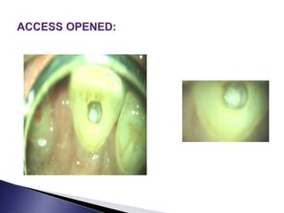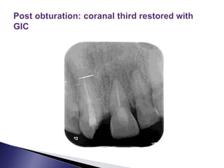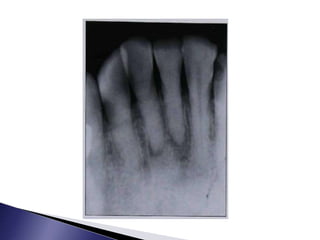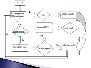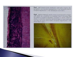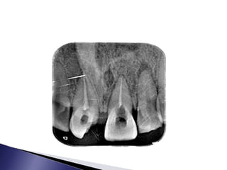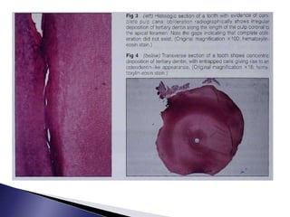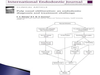 This document discusses calcific metamorphosis (CM), which is hard tissue deposition within the root canal space after traumatic dental injuries. CM is commonly seen in anterior teeth and can partially or fully obliterate the root canal space on radiographs. The document covers the definition, causes, incidence, radiographic appearance, histology, and proposed mechanisms of hard tissue formation in CM. It also discusses the controversy around treating teeth with CM, with most literature recommending observation unless symptoms appear. The document provides tips for locating and negotiating canals when CM is present, including using anatomical knowledge and correlating radiographs with tooth morphology.