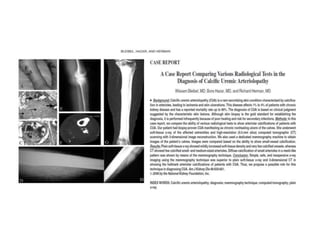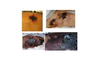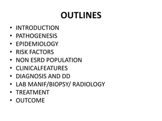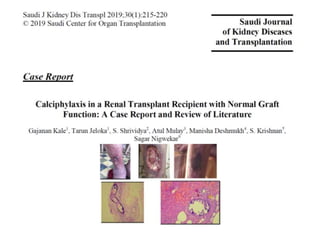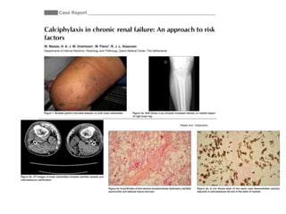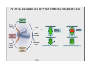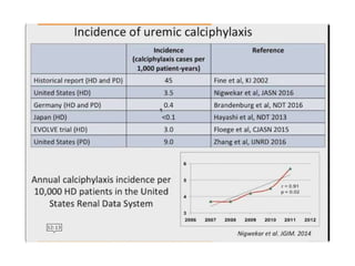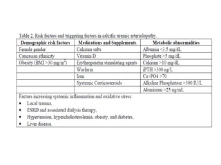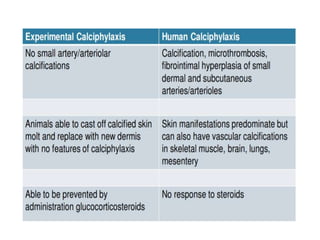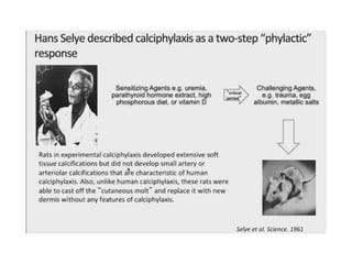 Calciphylaxis, also known as calcific uremic arteriolopathy, is a rare disorder characterized by calcification of the small blood vessels of the skin and subcutaneous fat. It most commonly occurs in patients with end-stage renal disease on dialysis. The calcification leads to reduced blood flow and painful skin lesions. Risk factors include hyperparathyroidism, vitamin D use, and warfarin use. Diagnosis is made clinically and confirmed with biopsy showing vessel calcification. Treatment involves sodium thiosulfate, hyperbaric oxygen, bisphosphonates, and wound care. Prognosis is poor with high mortality rates due to complications like infection and organ failure.