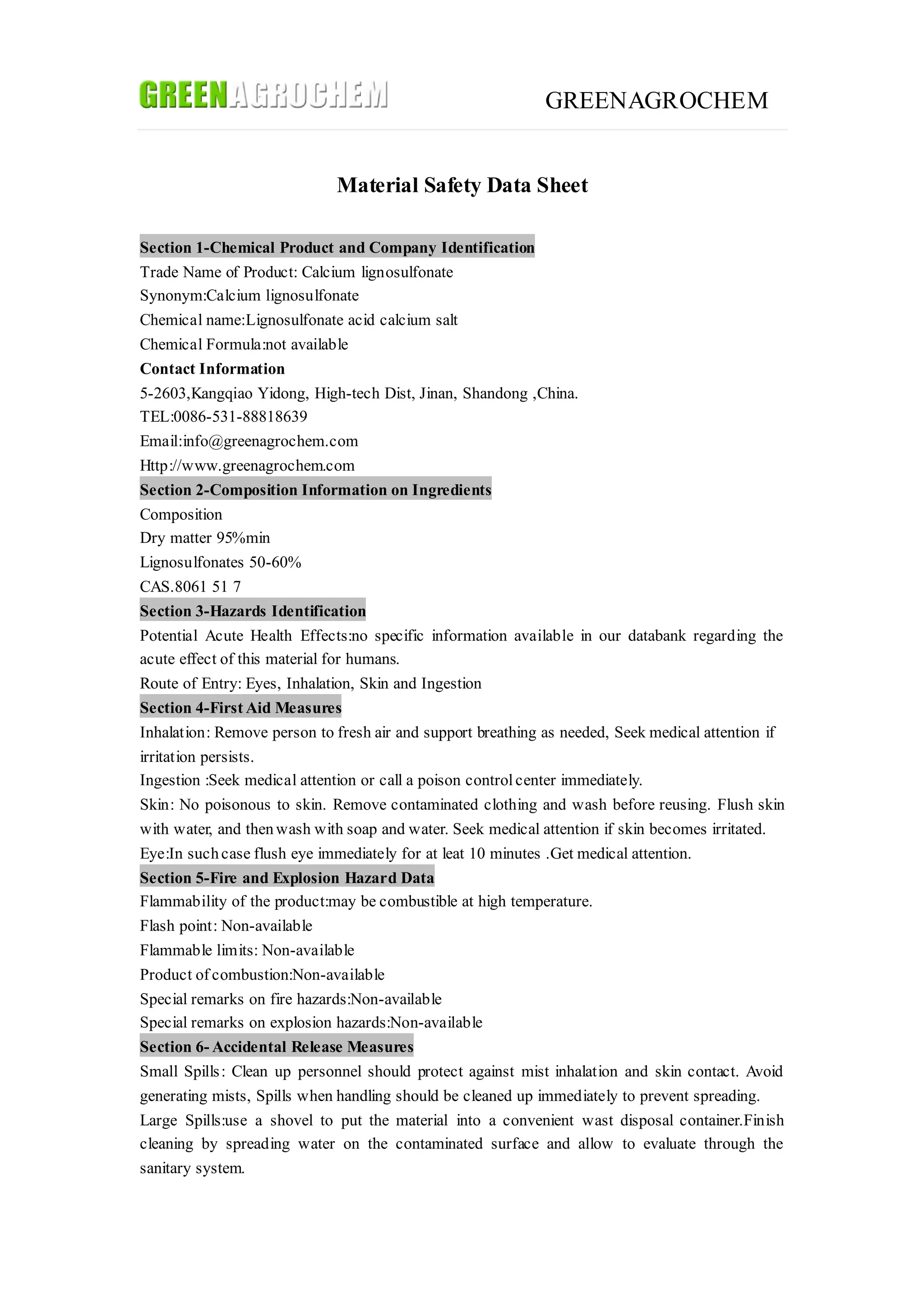 This Material Safety Data Sheet provides essential information about calcium lignosulfonate, including its composition, potential hazards, handling precautions, and emergency measures. It highlights the importance of personal protective equipment and safe storage conditions, as well as the product's ecological disposal requirements. The document also notes that eye and skin contact may cause irritation and provides first aid measures for exposure.