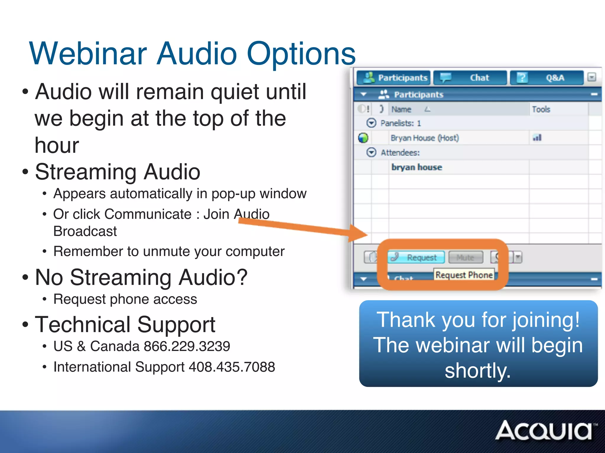 The webinar provided information about audio options for the webinar, technical support contact information, and instructions for submitting questions. It also advertised upcoming webinars and noted that slides and recordings would be posted within 48 hours. Finally, it announced that Acquia is hiring for various roles and provided a link to the careers page.