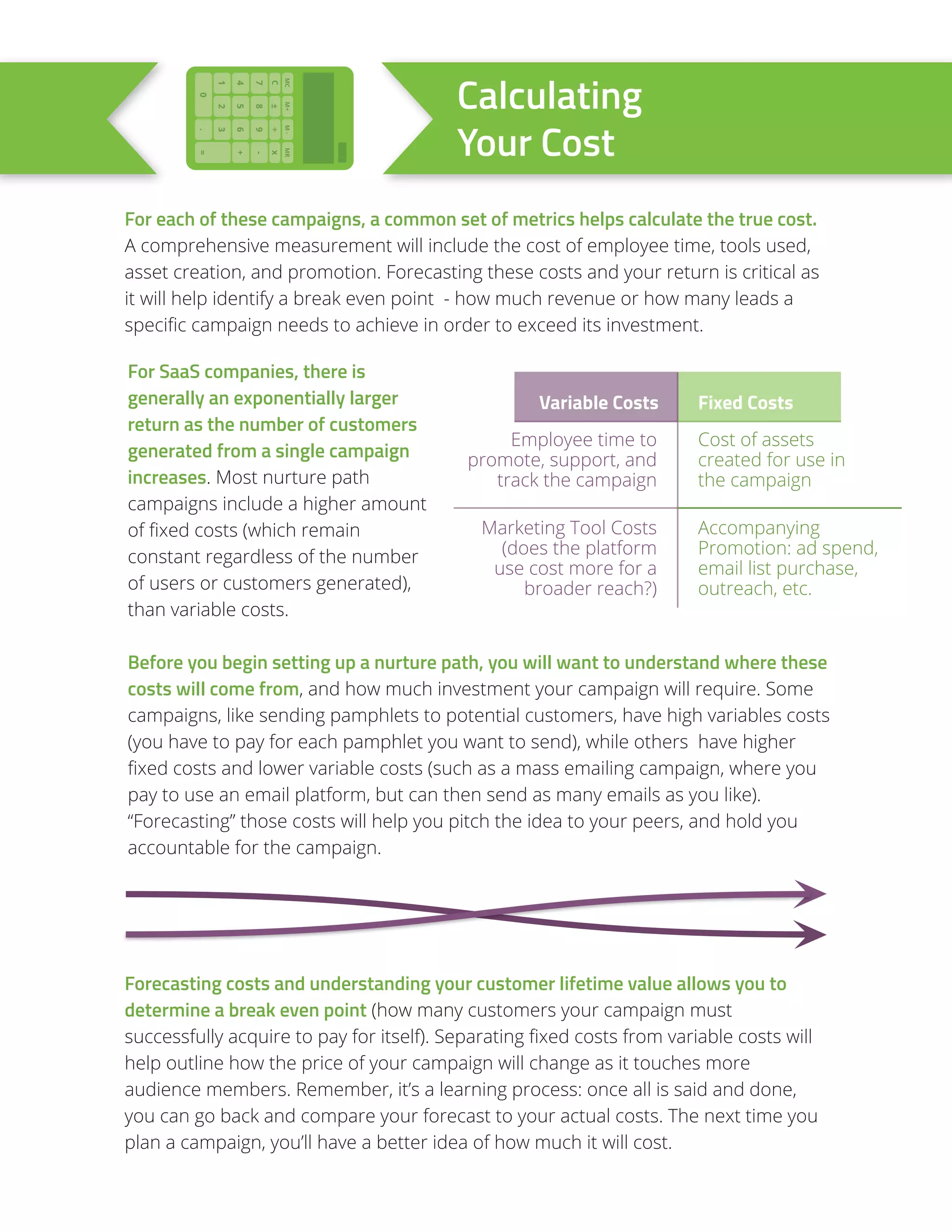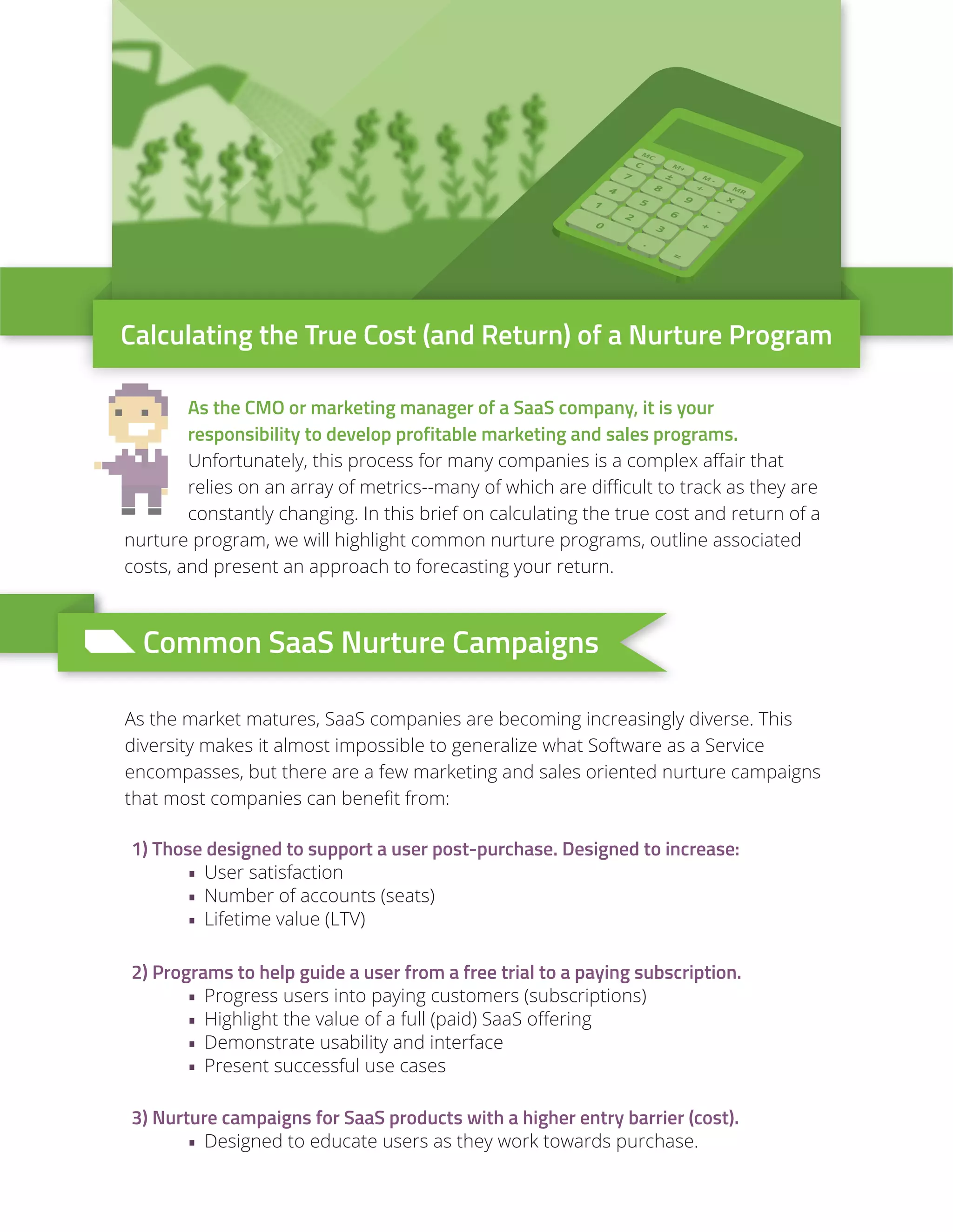 This document discusses how to calculate the true costs and returns of nurture marketing programs for SaaS companies. It outlines common nurture campaigns, associated fixed and variable costs, and how to forecast returns. It recommends separating costs, choosing an attribution model to fairly assign revenue from multiple touchpoints, and calculating the break even point for customers needed to cover program costs based on average customer lifetime value. The goal is for nurture programs to break even or provide a positive return on investment.