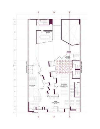 The document analyzes and summarizes the lighting and acoustic performance of spaces in a new library building in Kuala Lumpur, Malaysia. It calculates the daylight factor, illuminance levels, artificial lighting requirements, sound pressure levels, reverberation times, and sound reduction indices for the gallery, studio, academic collection, children's collection, and study lounge spaces. The analyses show that the spaces generally meet or exceed recommended lighting and acoustic standards to provide optimal environments for their intended uses.