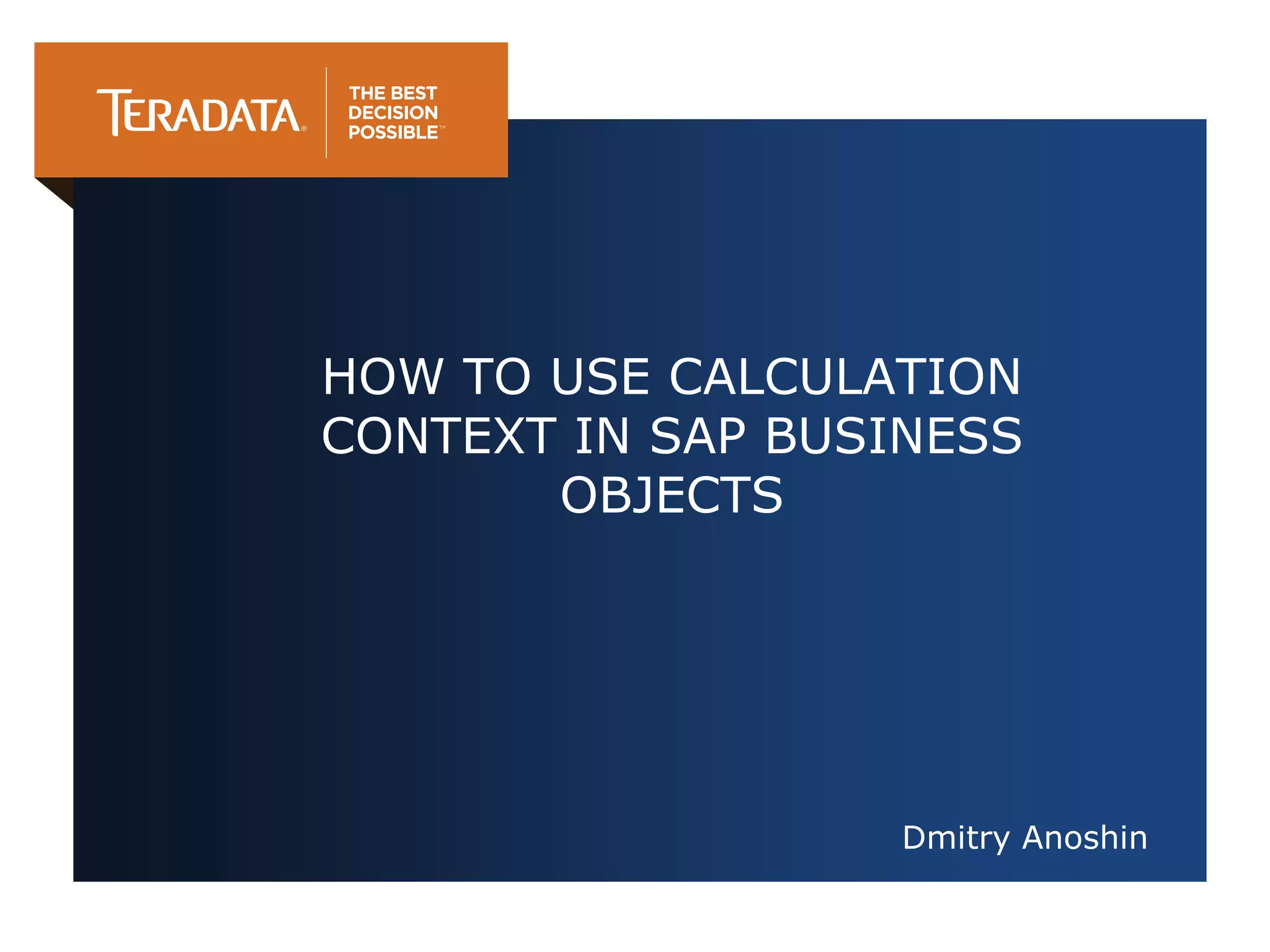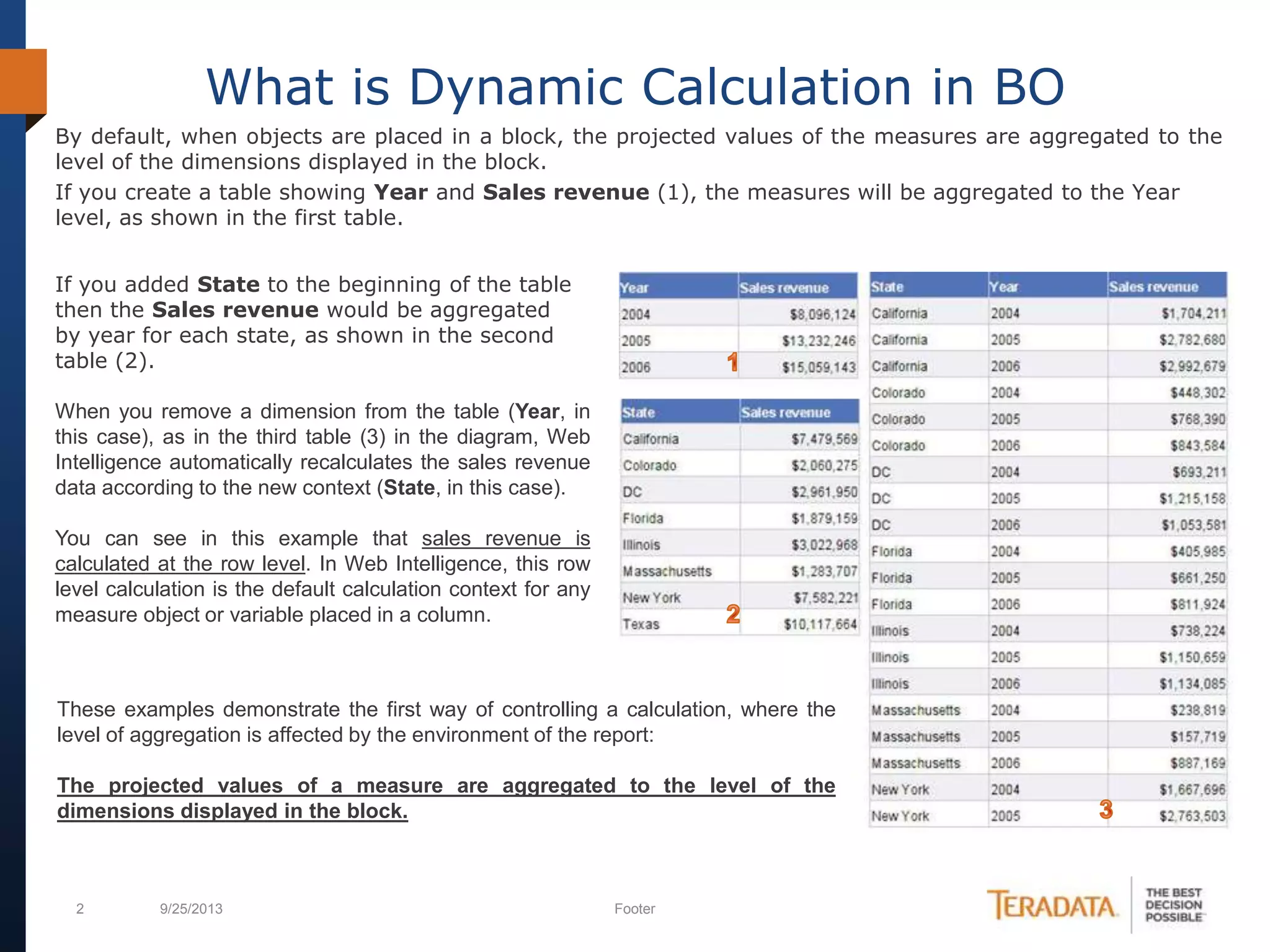 The document discusses how to control calculation context in SAP Business Objects by defining input and output contexts. By default, measures are aggregated to the level of dimensions displayed. To override this, input and output contexts can be specified. Operators like "In", "ForEach", and "Where" are used to define which dimensions should be included or excluded from calculations. Examples demonstrate how to use these operators to define contexts for calculations like finding the maximum sales revenue for a given state and year.