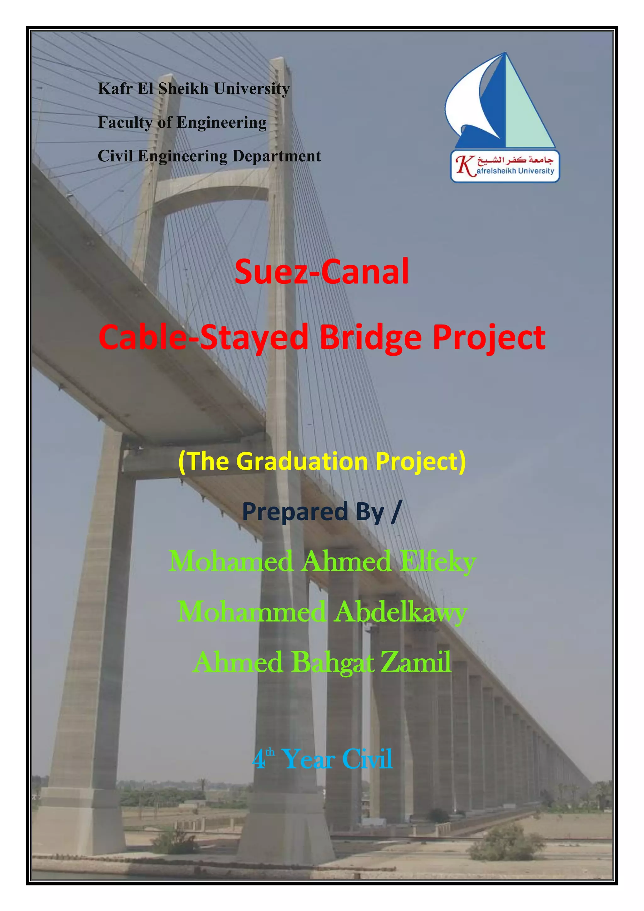 This document provides details on the design of a cable-stayed bridge project over the Suez Canal. It includes the following key points: