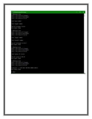 This document outlines 4 different programs: a calculator program, an area program to calculate geometric shapes, a program to find the largest number among 3 inputs, and a factorial program to calculate the factorial of a given number.