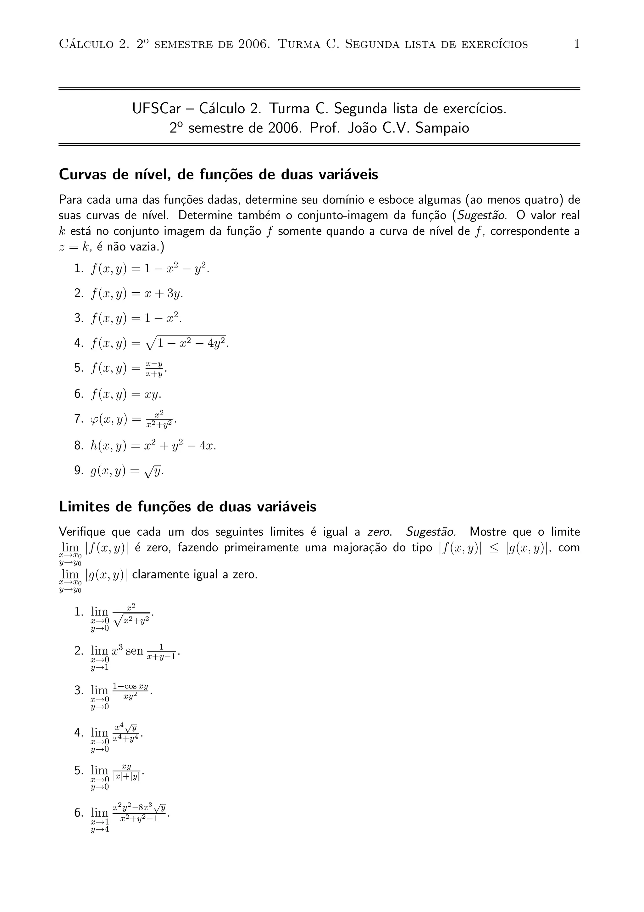 This document contains the solutions to a list of calculus exercises from the second semester of 2006 regarding curves of level sets of functions of two variables. It provides the domain and image set for 9 functions and graphs the level curves for 6 of the functions.