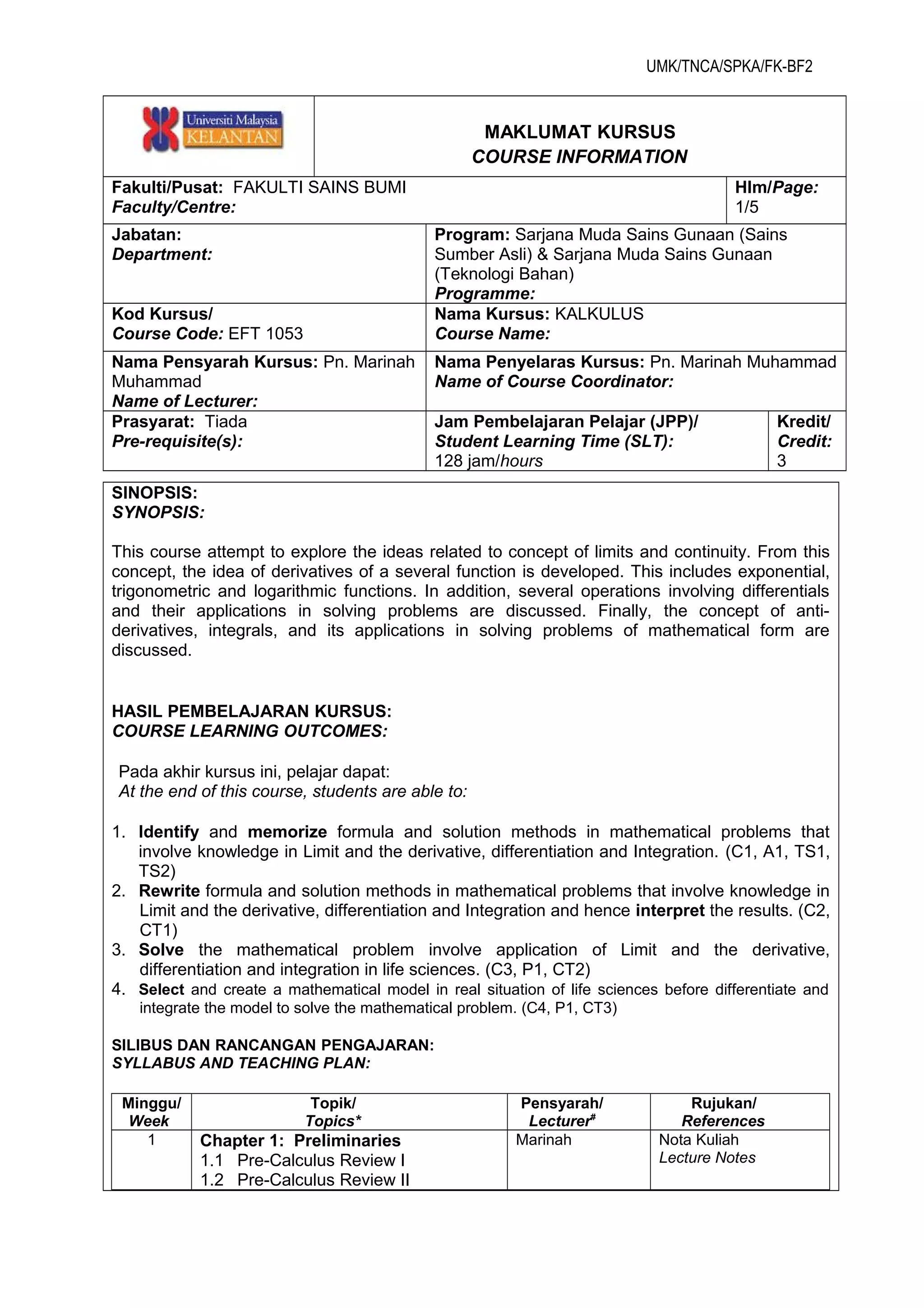 This document provides course information for a Calculus course taught at the Faculty of Earth Sciences. The course is designed to introduce students to key concepts in calculus, including limits, continuity, differentiation, integration and their applications. Over 16 weeks, topics such as derivatives of various functions, applications of derivatives, antiderivatives, integrals and their applications will be covered. Students will be assessed through exams, assignments, projects and class participation.