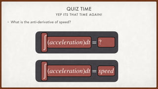 The document discusses anti-derivatives and how they relate to derivatives. It provides examples of taking the anti-derivative of acceleration to find speed and discusses how anti-derivatives are like rewinding a function to find the original function. Examples are given of using the rule that if the number in front of t is one more than the power, you copy that number to the power when taking the anti-derivative. The document also discusses using models to represent real-world phenomena and provides a simple example model of drag car speed over time.