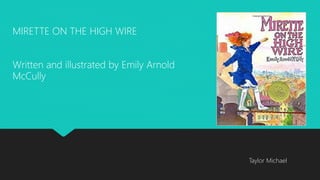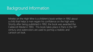Mirette on the High Wire is a children's book written in 1992 about a girl who helps a man regain his confidence performing on the high wire in 19th century Paris. The book uses watercolors to portray both realistic and cartoon-like illustrations. The author employs styles of realism to depict detailed scenes and naïve cartoon art to give illustrations a childlike feel. Rigid lines and shapes in the illustrations signify the unstable emotions of the man and difficult journey to face his fears on the high wire. Cool colors set a serious tone, and textures give a sense of the characters and setting. The balanced, symmetrical illustrations focus on the two people and their story of overcoming challenges.