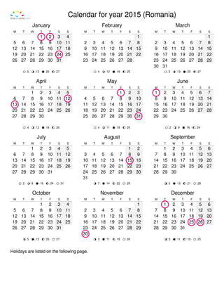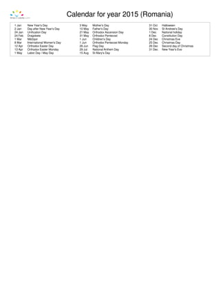 This document contains the calendar for the year 2015 in Romania. It lists the months of January through December with the days of the week and dates. Notable holidays are also listed, including New Year's Day, Orthodox Easter, Labor Day, Mother's Day, Flag Day, Christmas Eve and Christmas Day.