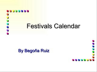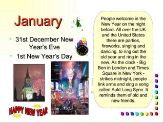 The document provides a calendar of festivals and holidays celebrated throughout the year globally and in specific countries like the UK, US, Ireland and Wales. Key events mentioned include New Year's Eve/Day, Valentine's Day, St Patrick's Day, Easter, Halloween, Thanksgiving, Christmas Eve/Day and Boxing Day. Many of the festivals have traditions associated with them like wearing shamrocks on St Patrick's Day, Easter egg hunts, pumpkin carving for Halloween and exchanging gifts on Christmas.