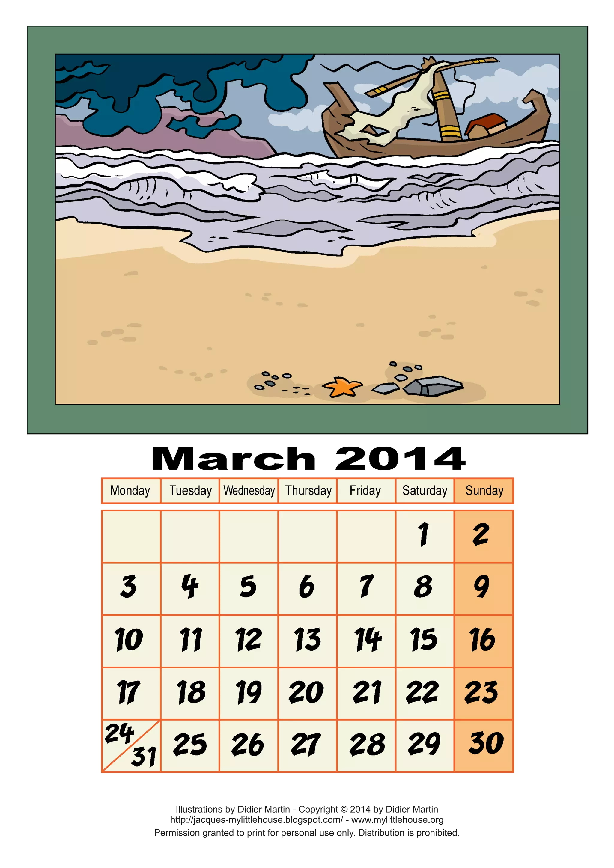 The document contains illustrations and instructions for making a frame out of paper. It includes diagrams of the frame parts, which are labeled as corners and a part to glue on the back after attaching a string. The document also provides information about the artist and copyright, stating that the illustrations were created by Didier Martin in 2014 and permission is granted for personal use only.