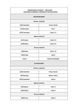 CALENDARI D’EXAMENS I CONTINGUTS PER AVALUACIÓ