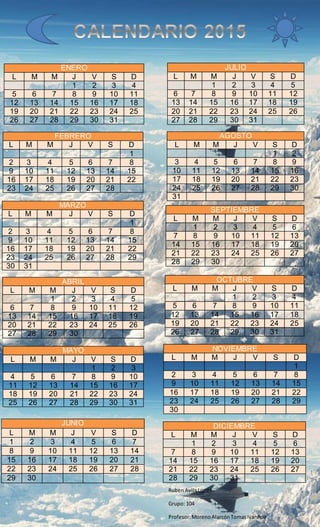 The document contains calendar pages for each month of the year. Each calendar page lists the days of the month and their corresponding dates along with the days of the week. The calendars are presented in both Spanish and English abbreviations for the months and days of the week.