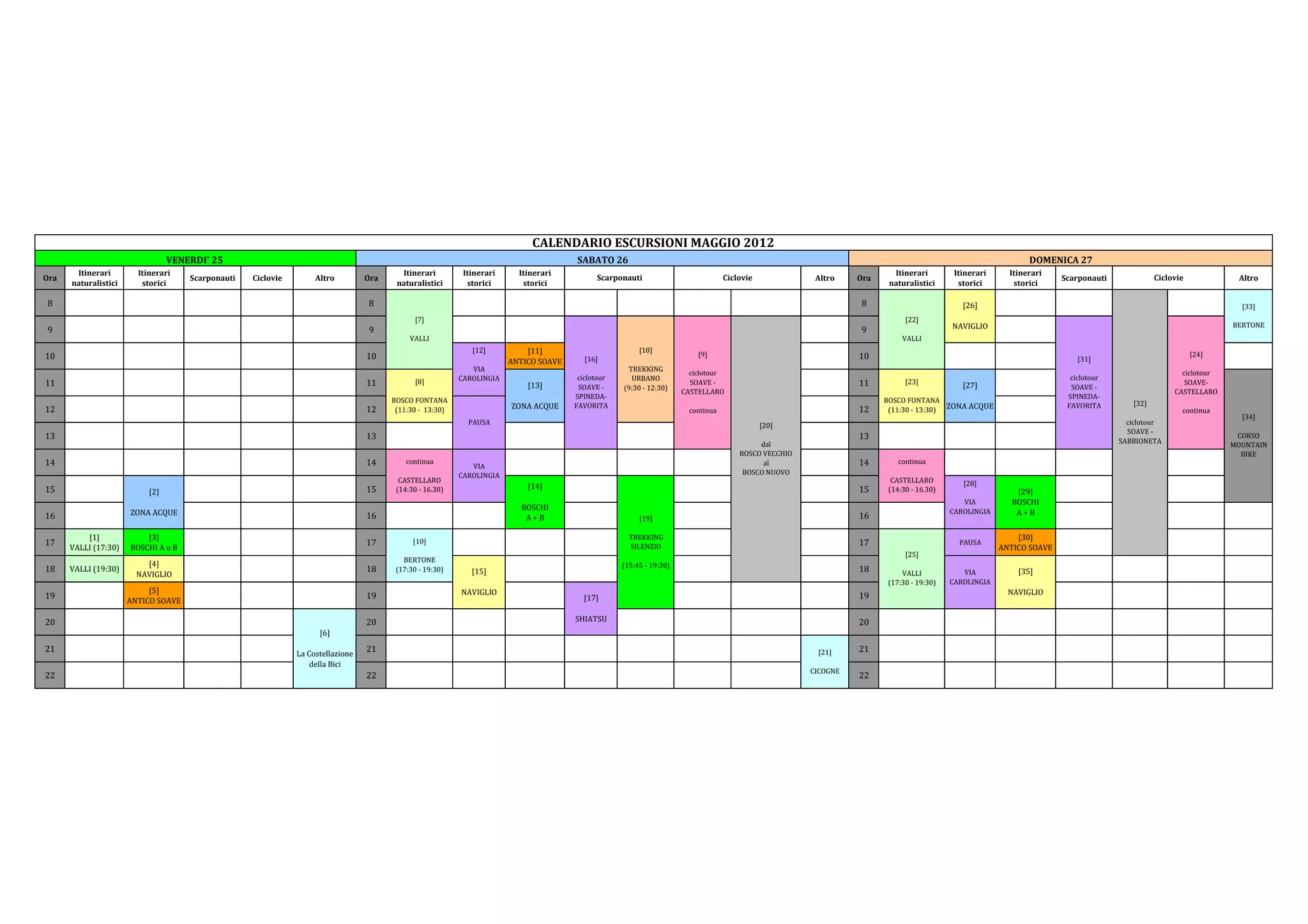 Il documento presenta il calendario delle escursioni programmate per il fine settimana dal 25 al 27 maggio 2012. Include dettagli su diversi itinerari, orari, responsabili e contatti per ciascuna attività. Sono previste escursioni naturalistiche, storiche e ciclotour.