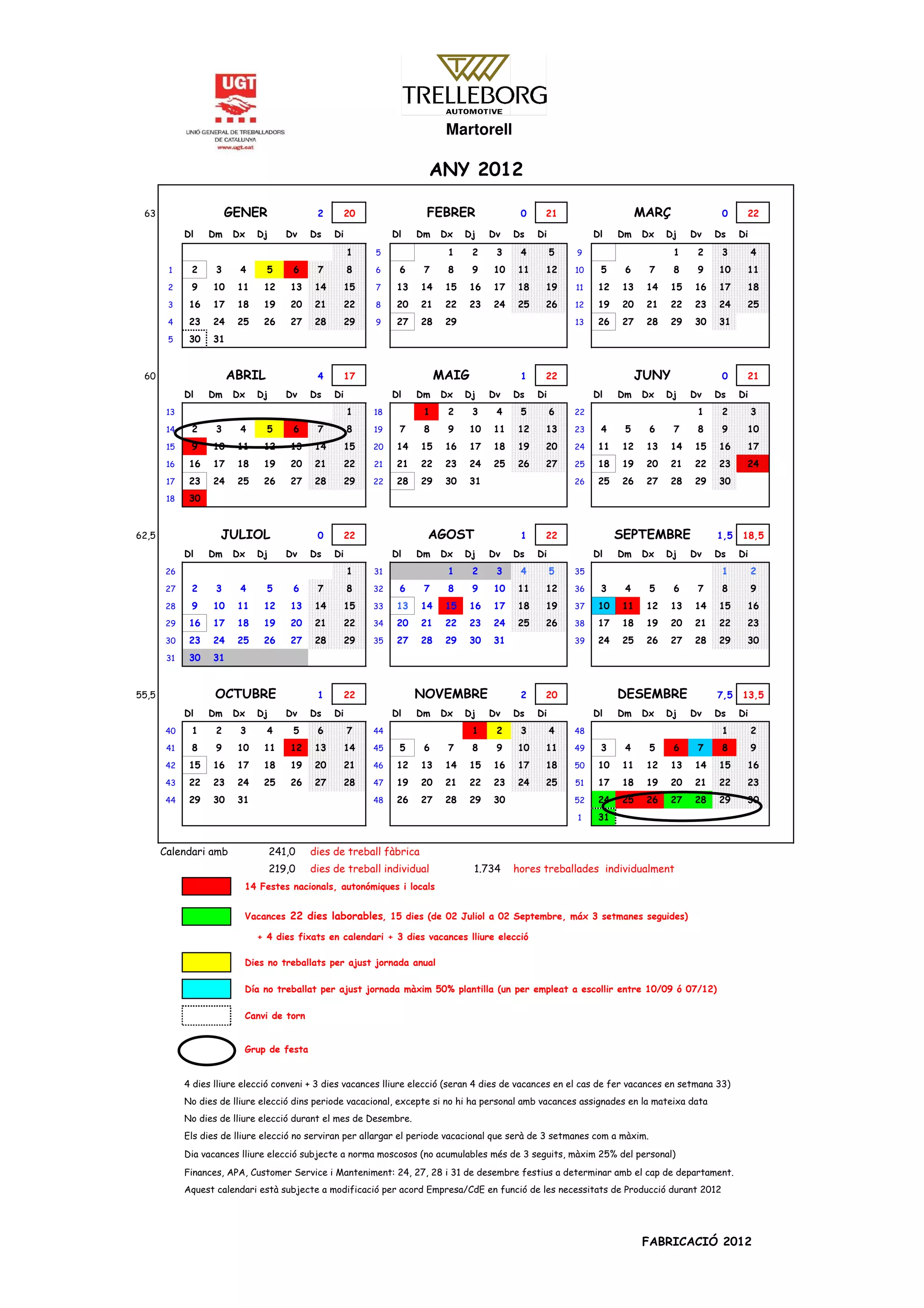 ANY 2012 63 GENER 2 20 FEBRER 0 21 MARÇ 0 22 Dl Dm Dx Dj Dv Ds Di Dl Dm Dx Dj Dv Ds Di Dl Dm Dx Dj Dv Ds Di 1 5 1 2 3 4 5 9 1 2 3 4 1 2 3 4 5 6 7 8 6 6 7 8 9 10 11 12 10 5 6 7 8 9 10 11 2 9 10 11 12 13 14 15 7 13 14 15 16 17 18 19 11 12 13 14 15 16 17 18 3 16 17 18 19 20 21 22 8 20 21 22 23 24 25 26 12 19 20 21 22 23 24 25 4 23 24 25 26 27 28 29 9 27 28 29 13 26 27 28 29 30 31 5 30 31 60 ABRIL 4 17 MAIG 1 22 JUNY 0 21 Dl Dm Dx Dj Dv Ds Di Dl Dm Dx Dj Dv Ds Di Dl Dm Dx Dj Dv Ds Di 13 1 18 1 2 3 4 5 6 22 1 2 3 14 2 3 4 5 6 7 8 19 7 8 9 10 11 12 13 23 4 5 6 7 8 9 10 15 9 10 11 12 13 14 15 20 14 15 16 17 18 19 20 24 11 12 13 14 15 16 17 16 16 17 18 19 20 21 22 21 21 22 23 24 25 26 27 25 18 19 20 21 22 23 24 17 23 24 25 26 27 28 29 22 28 29 30 31 26 25 26 27 28 29 30 18 30 62,5 JULIOL 0 22 AGOST 1 22 SEPTEMBRE 1,5 18,5 Dl Dm Dx Dj Dv Ds Di Dl Dm Dx Dj Dv Ds Di Dl Dm Dx Dj Dv Ds Di 26 1 31 1 2 3 4 5 35 1 2 27 2 3 4 5 6 7 8 32 6 7 8 9 10 11 12 36 3 4 5 6 7 8 9 28 9 10 11 12 13 14 15 33 13 14 15 16 17 18 19 37 10 11 12 13 14 15 16 29 16 17 18 19 20 21 22 34 20 21 22 23 24 25 26 38 17 18 19 20 21 22 23 30 23 24 25 26 27 28 29 35 27 28 29 30 31 39 24 25 26 27 28 29 30 31 30 31 55,5 OCTUBRE 1 22 NOVEMBRE 2 20 DESEMBRE 7,5 13,5 Dl Dm Dx Dj Dv Ds Di Dl Dm Dx Dj Dv Ds Di Dl Dm Dx Dj Dv Ds Di 40 1 2 3 4 5 6 7 44 1 2 3 4 48 1 2 41 8 9 10 11 12 13 14 45 5 6 7 8 9 10 11 49 3 4 5 6 7 8 9 42 15 16 17 18 19 20 21 46 12 13 14 15 16 17 18 50 10 11 12 13 14 15 16 43 22 23 24 25 26 27 28 47 19 20 21 22 23 24 25 51 17 18 19 20 21 22 23 44 29 30 31 48 26 27 28 29 30 52 24 25 26 27 28 29 30 1 31 Calendari amb 241,0 dies de treball fàbrica 219,0 dies de treball individual 1.734 hores treballades individualment 14 Festes nacionals, autonómiques i locals Vacances 22 dies laborables, 15 dies (de 02 Juliol a 02 Septembre, máx 3 setmanes seguides) + 4 dies fixats en calendari + 3 dies vacances lliure elecció Dies no treballats per ajust jornada anual Día no treballat per ajust jornada màxim 50% plantilla (un per empleat a escollir entre 10/09 ó 07/12) Canvi de torn Grup de festa 4 dies lliure elecció conveni + 3 dies vacances lliure elecció (seran 4 dies de vacances en el cas de fer vacances en setmana 33) No dies de lliure elecció dins periode vacacional, excepte si no hi ha personal amb vacances assignades en la mateixa data No dies de lliure elecció durant el mes de Desembre. Els dies de lliure elecció no serviran per allargar el periode vacacional que serà de 3 setmanes com a màxim. Dia vacances lliure elecció subjecte a norma moscosos (no acumulables més de 3 seguits, màxim 25% del personal) Finances, APA, Customer Service i Manteniment: 24, 27, 28 i 31 de desembre festius a determinar amb el cap de departament. Aquest calendari està subjecte a modificació per acord Empresa/CdE en funció de les necessitats de Producció durant 2012 FABRICACIÓ 2012