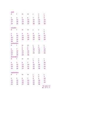 junio<br />dlmmjvs<br />1234<br/>567891011<br />12131415161718<br />19202122232425<br />2627282930<br />julio<br />dlmmjvs<br />12<br />3456789<br />10111213141516<br />17181920212223<br />24252627282930<br />31<br />agosto<br />dlmmjvs<br />123456<br />78910111213<br />14151617181920<br />21222324252627<br />28293031<br />mayo<br />dlmmjvs<br />1234567<br />891011121314<br />15161718192021<br />22232425262728<br />293031<br />enero<br />dlmmjvs<br />1<br />2345678<br />9101112131415<br />16171819202122<br />23242526272829<br />3031<br />marzo<br />dlmmjvs<br />12345<br />6789101112<br />13141516171819<br />20212223242526<br />2728293031<br />febrero<br />dlmmjvs<br />12345<br />6789101112<br />13141516171819<br />20212223242526<br />2728<br />abril<br />dlmmjvs<br />12<br />3456789<br />10111213141516<br />17181920212223<br />24252627282930<br />octubre<br />dlmmjvs<br />1<br />2345678<br />9101112131415<br />16171819202122<br />23242526272829<br />3031<br />noviembre<br />dlmmjvs<br />12345<br />6789101112<br />13141516171819<br />20212223242526<br />27282930<br />diciembre<br />dlmmjvs<br />123<br />45678910<br />11121314151617<br />18192021222324<br />25262728293031<br />septiembre<br />dlmmjvs<br />123<br />45678910<br />11121314151617<br />18192021222324<br />252627282930<br />2011<br />