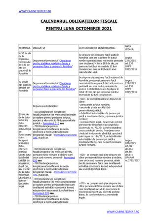 Documentul detaliază calendarul obligațiilor fiscale pentru luna octombrie 2021, incluzând termenele pentru depunerea diverselor declarații fiscale pentru contribuabili. Acestea includ formularele pentru stabilirea rezidenței fiscale, declarații de înregistrare fiscală și mențiuni pentru persoane fizice și juridice. De asemenea, sunt menționate tipurile de contribuabili afectați și baza legală pentru fiecare obligație în parte.