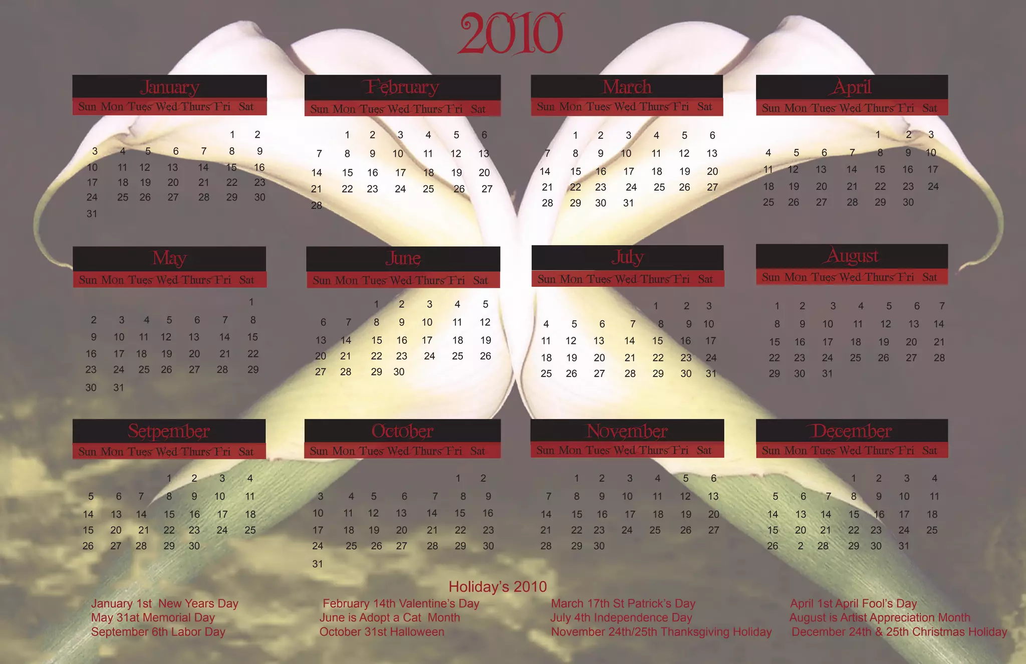 The document displays a calendar for the year 2010 with the months of January through December shown. Each month shows the days of the week and dates. Several U.S. holidays are also listed at the bottom for the year 2010 including New Year's Day, Valentine's Day, St. Patrick's Day, April Fool's Day, Memorial Day, Independence Day, Labor Day, Halloween, Thanksgiving, and Christmas.