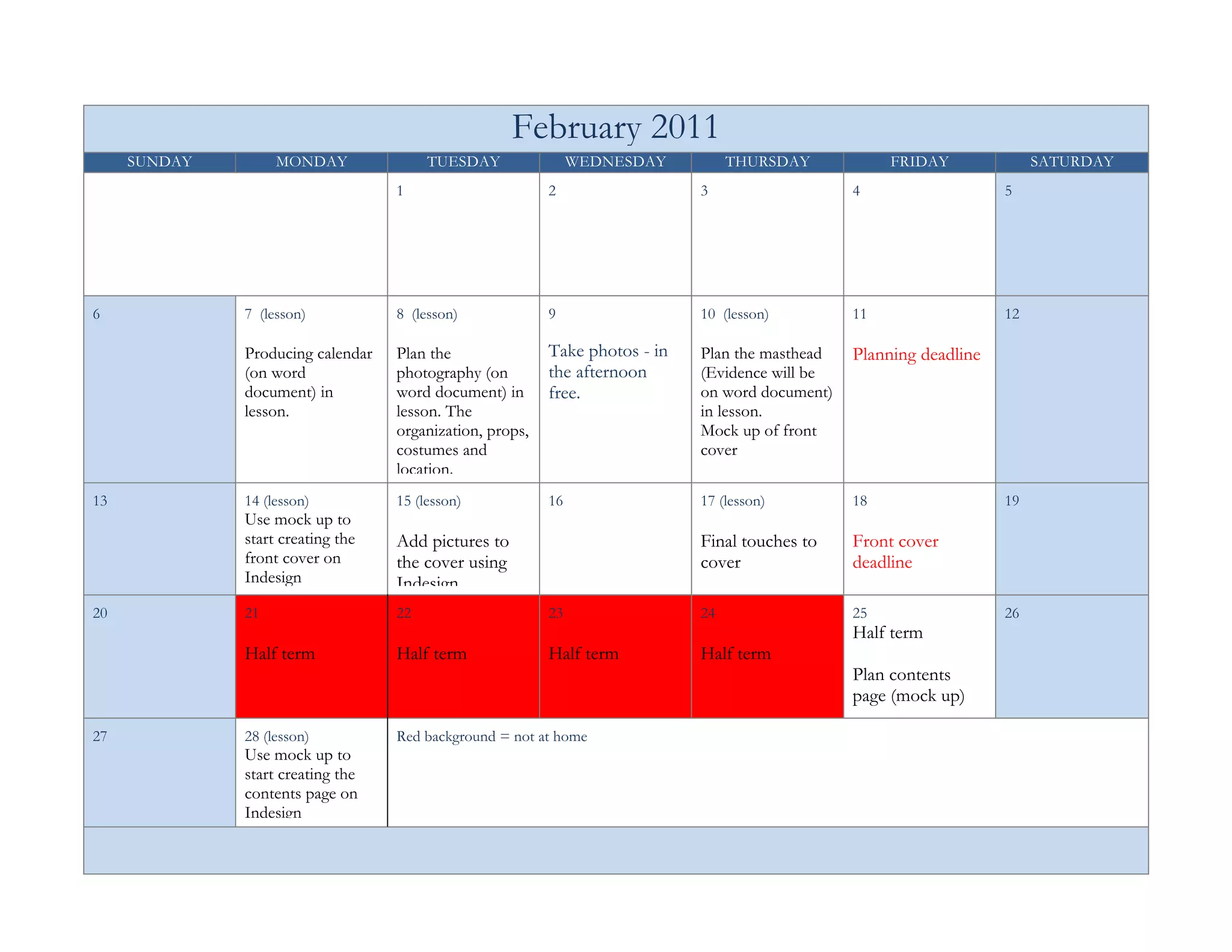 The document contains calendars for January through December 2011 that list lesson dates and deadlines for a student multimedia project. In January and February, lessons cover producing calendars, planning photography, and designing magazine covers in InDesign. March lessons involve adding images and finalizing covers, contents pages, and double page spreads. April contains portfolio deadlines. May lessons involve evaluation and presentation of the final magazine.