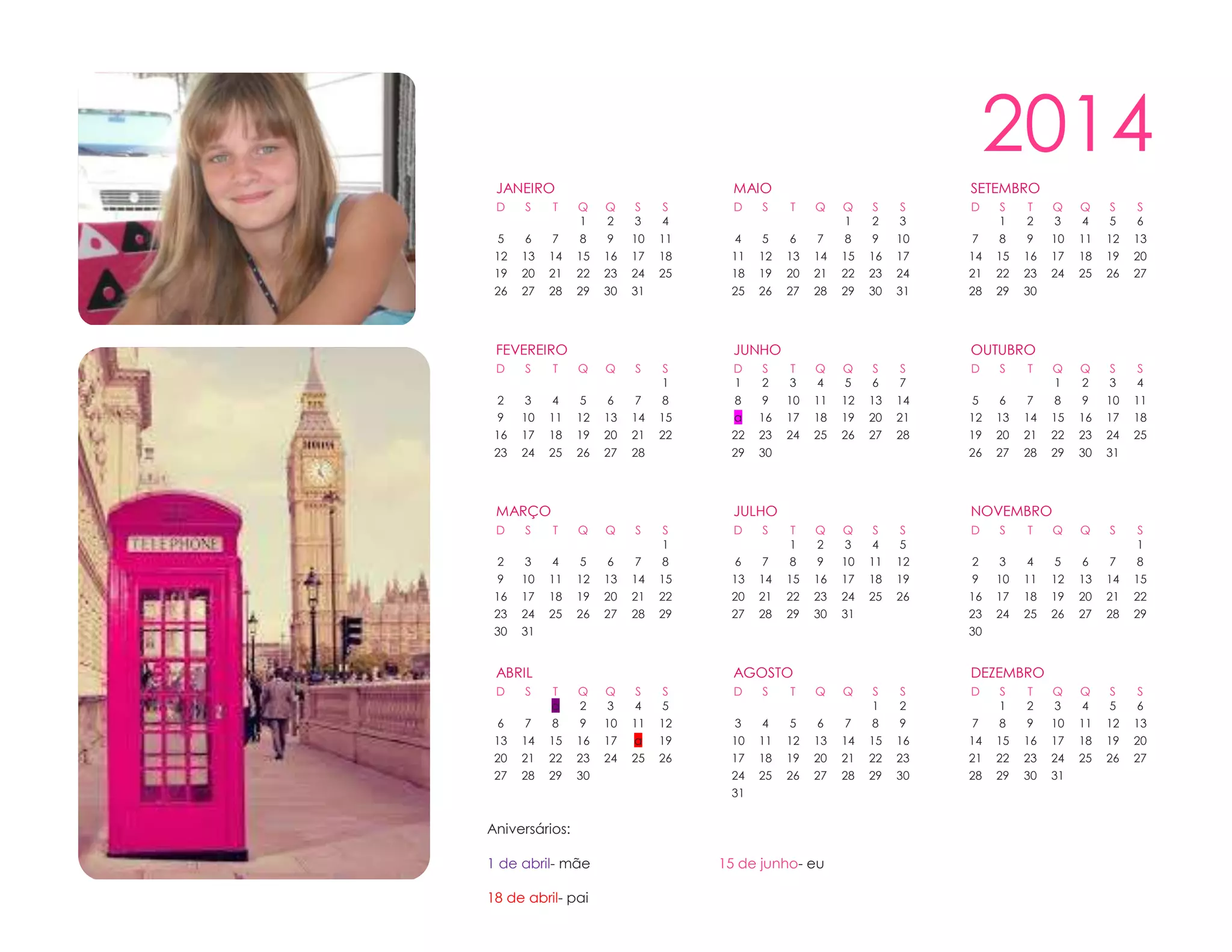 Q Q S S 1 2 3 4 5 6 7 8 9 10 11 12 13 14 15 16 17 18 19 20 21 22 23 24 25 26 27 28 29 30 31 MAIO D S T Q Q S S 1 2 3 4 5 6 7 8 9 10 11 12 13 14 15 16 17 18 19 20 21 22 23 24 25 26 27 28 29 30 31 SETEMBRO D S T Q Q S S 1 2 3 4 5 6 7 8 9 10 11 12 13 14 15 16 17 18 19 20 21 22 23 24 25 26 27 28 29 30 FEVEREIRO D S T Q Q S S 1 2 3 4 5 6 7 8 9 10 11 12 13 14 15 16 17 18 19 20 21 22 23 24 25 26 27 28 JUNHO D S T Q Q S S 1 2 3 4 5 6 7 8 9 10 11 12 13 14 α 16 17 18 19 20 21 22 23 24 25 26 27 28 29 30 OUTUBRO D S T Q Q S S 1 2 3 4 5 6 7 8 9 10 11 12 13 14 15 16 17 18 19 20 21 22 23 24 25 26 27 28 29 30 31 MARÇO D S T Q Q S S 1 2 3 4 5 6 7 8 9 10 11 12 13 14 15 16 17 18 19 20 21 22 23 24 25 26 27 28 29 30 31 JULHO D S T Q Q S S 1 2 3 4 5 6 7 8 9 10 11 12 13 14 15 16 17 18 19 20 21 22 23 24 25 26 27 28 29 30 31 NOVEMBRO D S T Q Q S S 1 2 3 4 5 6 7 8 9 10 11 12 13 14 15 16 17 18 19 20 21 22 23 24 25 26 27 28 29 30 ABRIL D S T Q Q S S α 2 3 4 5 6 7 8 9 10 11 12 13 14 15 16 17 α 19 20 21 22 23 24 25 26 27 28 29 30 AGOSTO D S T Q Q S S 1 2 3 4 5 6 7 8 9 10 11 12 13 14 15 16 17 18 19 20 21 22 23 24 25 26 27 28 29 30 31 DEZEMBRO D S T Q Q S S 1 2 3 4 5 6 7 8 9 10 11 12 13 14 15 16 17 18 19 20 21 22 23 24 25 26 27 28 29 30 31 Aniversários: 1 de abril- mãe 15 de junho- eu 18 de abril- pai
