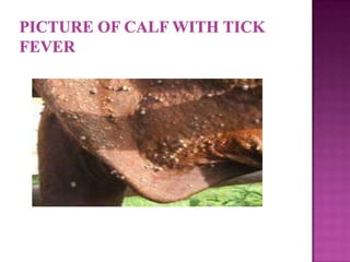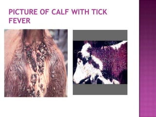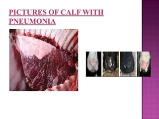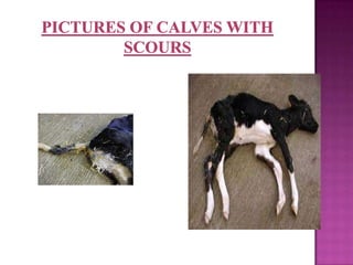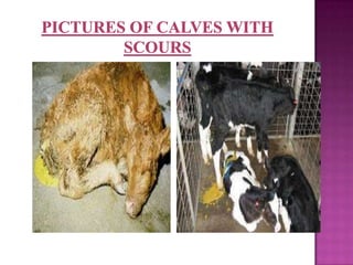 This document discusses three common calf diseases in Jamaica: calf scours, calf pneumonia, and tick fever. Calf scours is diarrhea with many potential causes including bacteria, viruses, and protozoa. Affected calves show dehydration, fever, and bloody diarrhea. Treatment involves fluid therapy and antibiotics. Calf pneumonia is a respiratory disease caused by bacteria and viruses. Calves display nasal discharge, cough, and reduced appetite. Preventive measures include vaccination and improving ventilation. Tick fever causes fever and weakness transmitted by tick bites. Affected cattle are treated and vaccination helps prevent the disease.