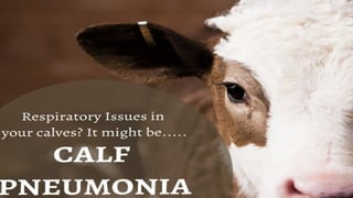 This document discusses bovine respiratory disease (BRD) in calves, which is caused by various viruses and bacteria. It can cause pneumonia of varying severity. Common viral causes include respiratory syncytial virus, parainfluenza 3, and bovine viral diarrhea virus. Bacterial pathogens like Mannheimia haemolytica may cause secondary infections. Calves aged 2-5 months are most susceptible. Clinical signs include cough, nasal discharge, fever and respiratory distress. Diagnosis involves virus isolation, serology and histopathology. Treatment consists of antibiotics and supportive care. Vaccination helps control the spread of BRD.