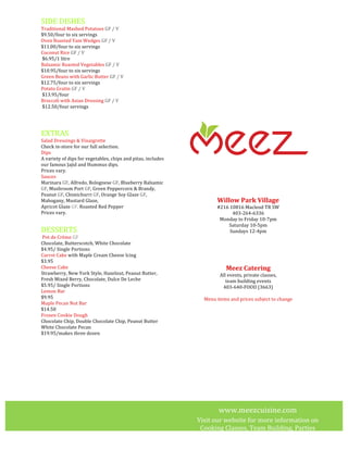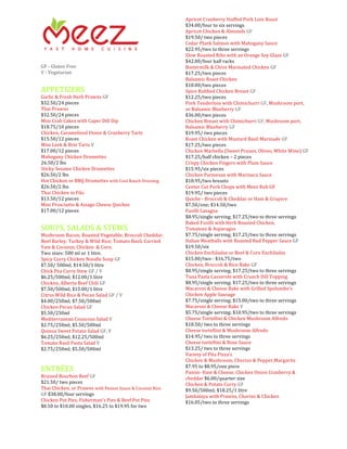 The document lists various gluten-free and vegetarian appetizers, soups, salads, entrées, side dishes, extras, and desserts offered by a catering service, along with their prices and portion sizes. Menu items include a wide range of entrees like chicken pot pies, braised bourbon beef, and various salads. It also provides details about the catering service's hours, location, and contact information for events and cooking classes.