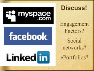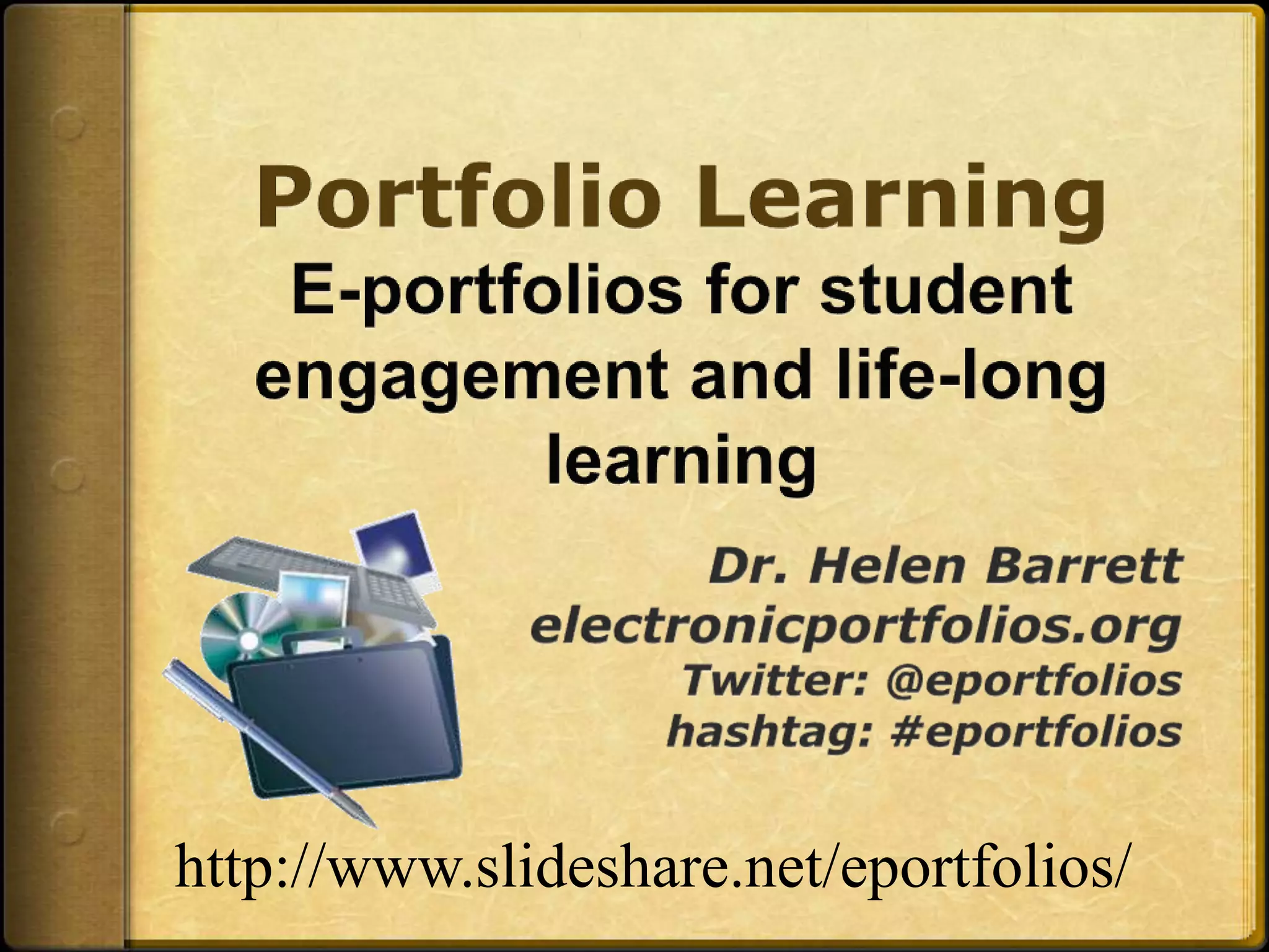 This document discusses the use of e-portfolios to support student engagement and lifelong learning. It defines e-portfolios as purposeful collections of work and reflections that demonstrate a student's efforts, progress, goals and achievements over time. E-portfolios can serve multiple purposes including learning, showcase, and assessment. Key aspects of e-portfolios discussed are the use of reflection to support deep learning, collaboration, and developing students' understanding of themselves. Implementation should be developmental, starting with basic collections and capturing reflections as students progress through grades.