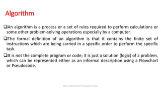 This document discusses algorithms and flowcharts. It defines an algorithm as a set of steps to solve a problem, especially by a computer. Algorithms have inputs, outputs, and must be unambiguous, finite, effective, and language-independent. Flowcharts provide a graphical representation of algorithms using standard symbols connected by arrows to show the flow. The document gives examples of algorithms to add two numbers and provides a flowchart to multiply two numbers as illustrations.