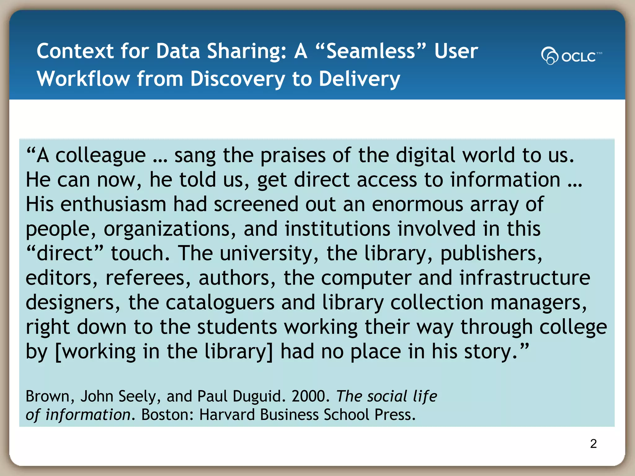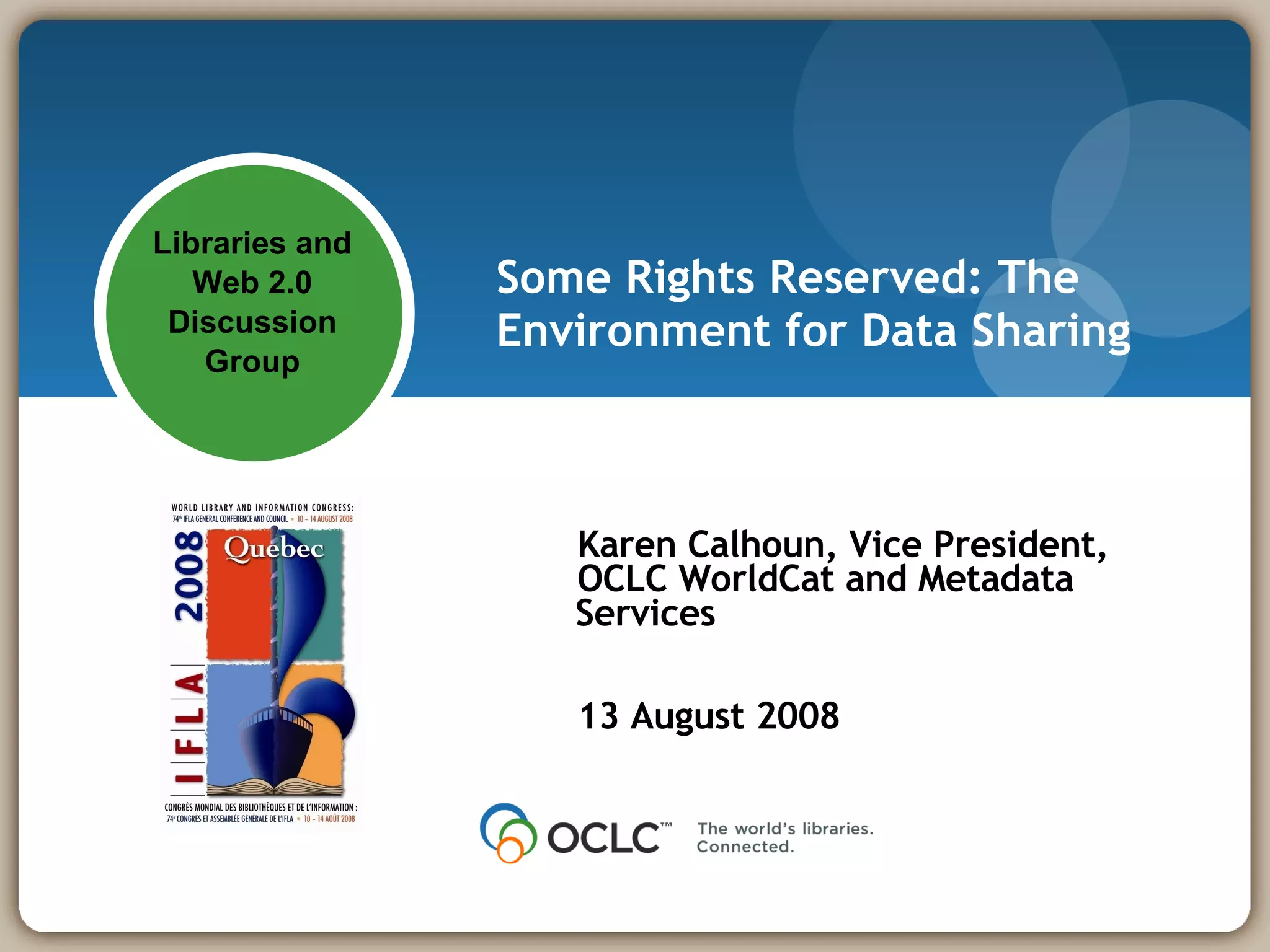 The document discusses the evolving landscape of data sharing, emphasizing that users expect seamless access to information and that the traditional models of data control are shifting towards open data exchange. It highlights the challenges faced by organizations in adapting to user expectations and the necessity for clear data sharing policies, as well as the financial implications of these trends. The document calls for libraries to reduce operational costs, enhance their visibility online, and foster collaborative relationships in the data sharing ecosystem.