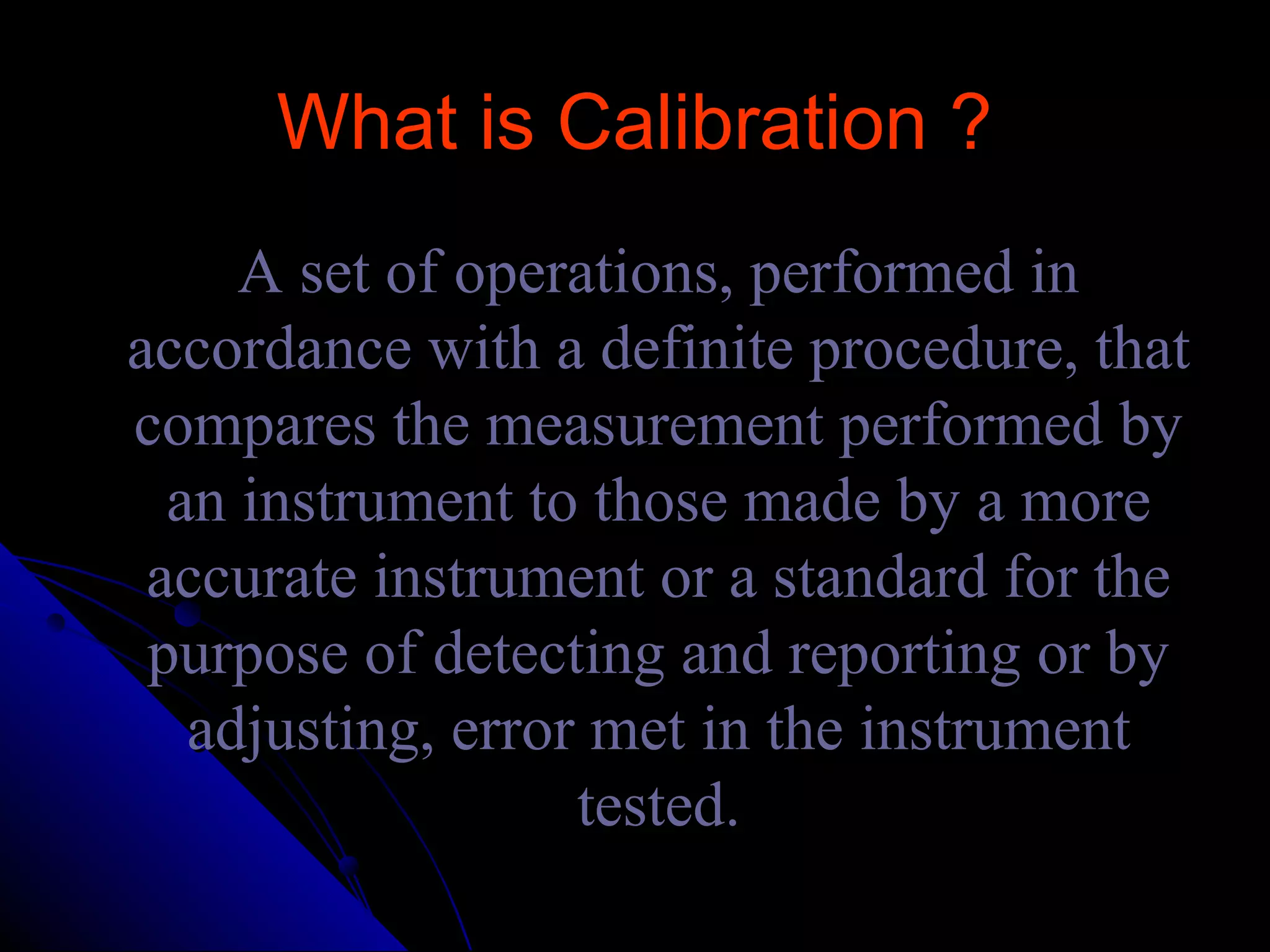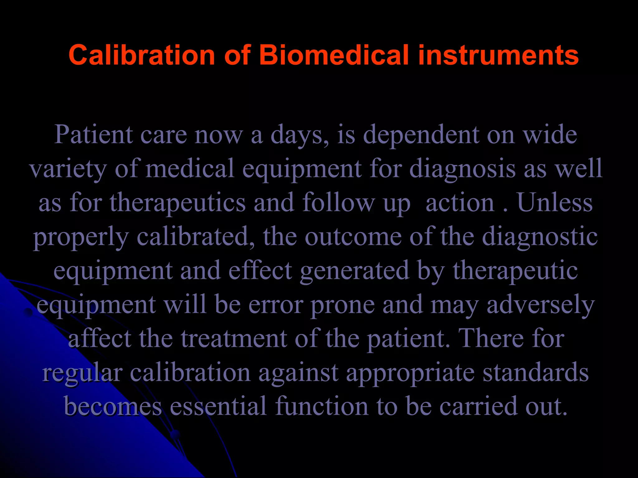 Calibration of biomedical instruments is important to ensure accurate diagnostic and therapeutic outcomes for patients. Regular calibration against standards is needed because uncalibrated equipment can produce errors that negatively impact treatment. Calibration involves comparing instrument measurements to a more accurate standard or instrument to detect and correct any errors. Key biomedical equipment used in calibration include multi-parameter simulators for ECGs and vital signs, SpO2 simulators, defibrillator analyzers, infusion device analyzers, electrosurgical analyzers, incubator analyzers, ultrasound wattmeters, and international safety analyzers which measure critical safety parameters. Calibration helps ensure quality, safety, and the acceptability of health care and diagnostic test results.