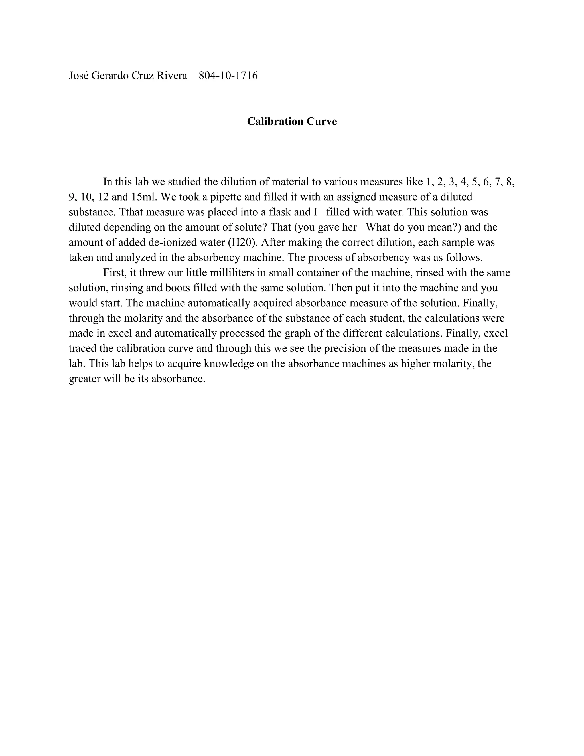 This document summarizes a lab experiment where a student created a calibration curve by diluting a substance to various volumes between 1-15ml and measuring the absorbance. The student pipetted the assigned amounts of diluted substance into flasks filled with deionized water to create solutions of different concentrations. Each sample was then analyzed in an absorbance machine, which automatically measured and recorded the absorbance. The student entered the molarity and absorbance measurements into an Excel spreadsheet, which graphed the calibration curve and showed the precision of the lab measurements. The calibration curve demonstrated that higher molarity solutions have greater absorbance.