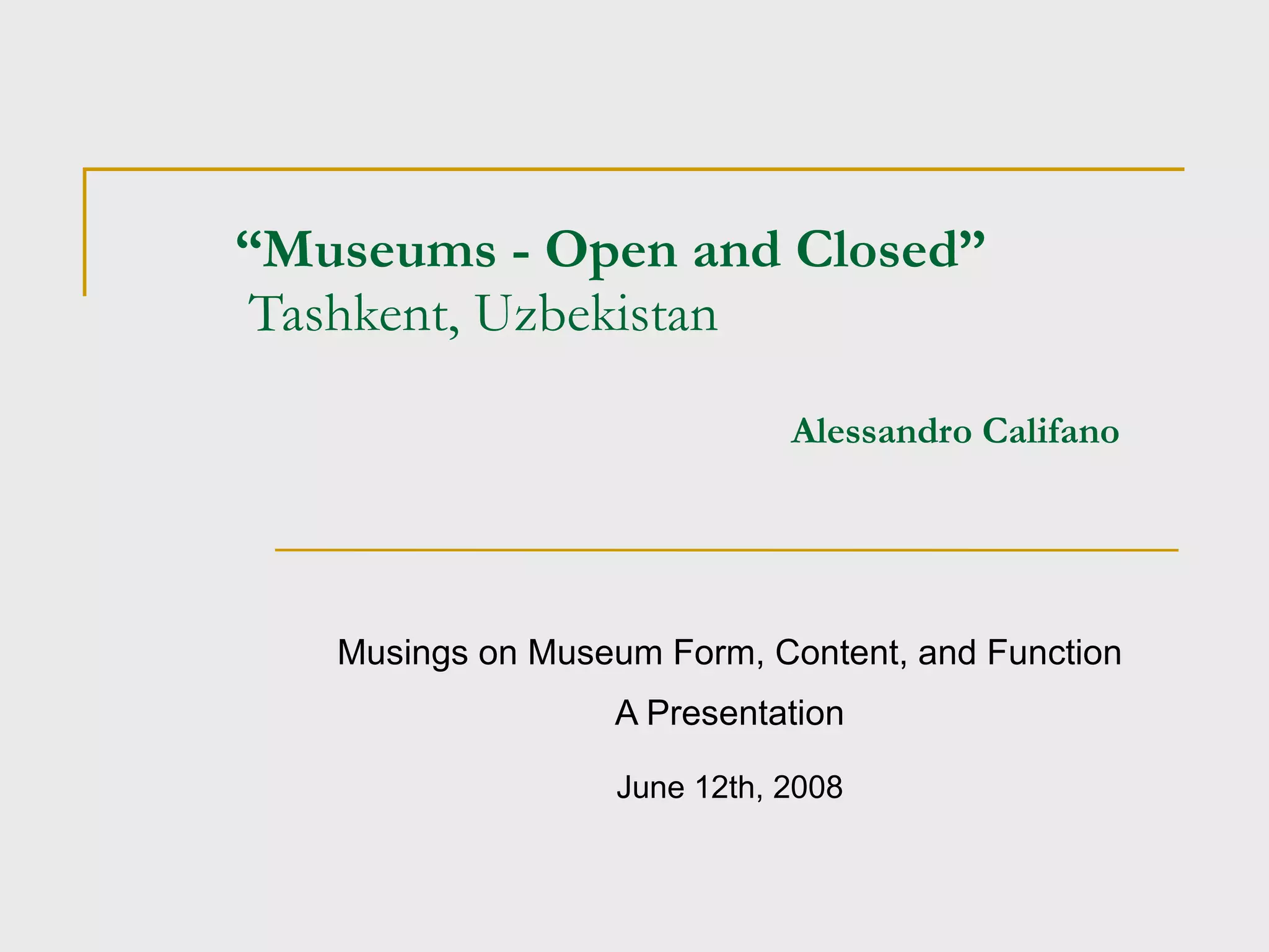 The document discusses the evolving role of museums as institutions in society, exploring concepts such as 'open' versus 'closed' museums and their impact on cultural communication. It highlights the importance of heritage, both tangible and intangible, and presents innovative ideas on integrating old and new architectural forms in museum design. The presentation also reflects on the psychological functions of buildings, emphasizing that museums must engage creatively with their communities to remain relevant.