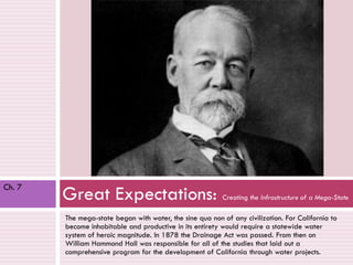 The document summarizes key events and developments in California's history from 1920-1963. It discusses how the state established critical infrastructure like dams, aqueducts and reservoirs during this period to support its growing population. It also covers the impact of the Great Depression, including public works programs, as well as labor issues. Additionally, it outlines California's connection to the military and role in World War 2, including the internment of Japanese Americans and massive population growth in the postwar years.