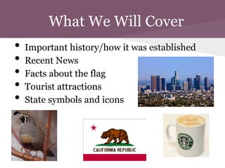 California is known as the "Golden State" due to the Gold Rush of 1848. It has a long coastline and diverse geography. Major tourist attractions include Hollywood, the Golden Gate Bridge, and Disneyland. The state symbols include the grizzly bear, California valley quail, and California poppy. Major industries include agriculture, oil/mining, water, lumber, and tourism. As of 2011, California's population was over 37 million people, mainly concentrated in Los Angeles and San Diego.