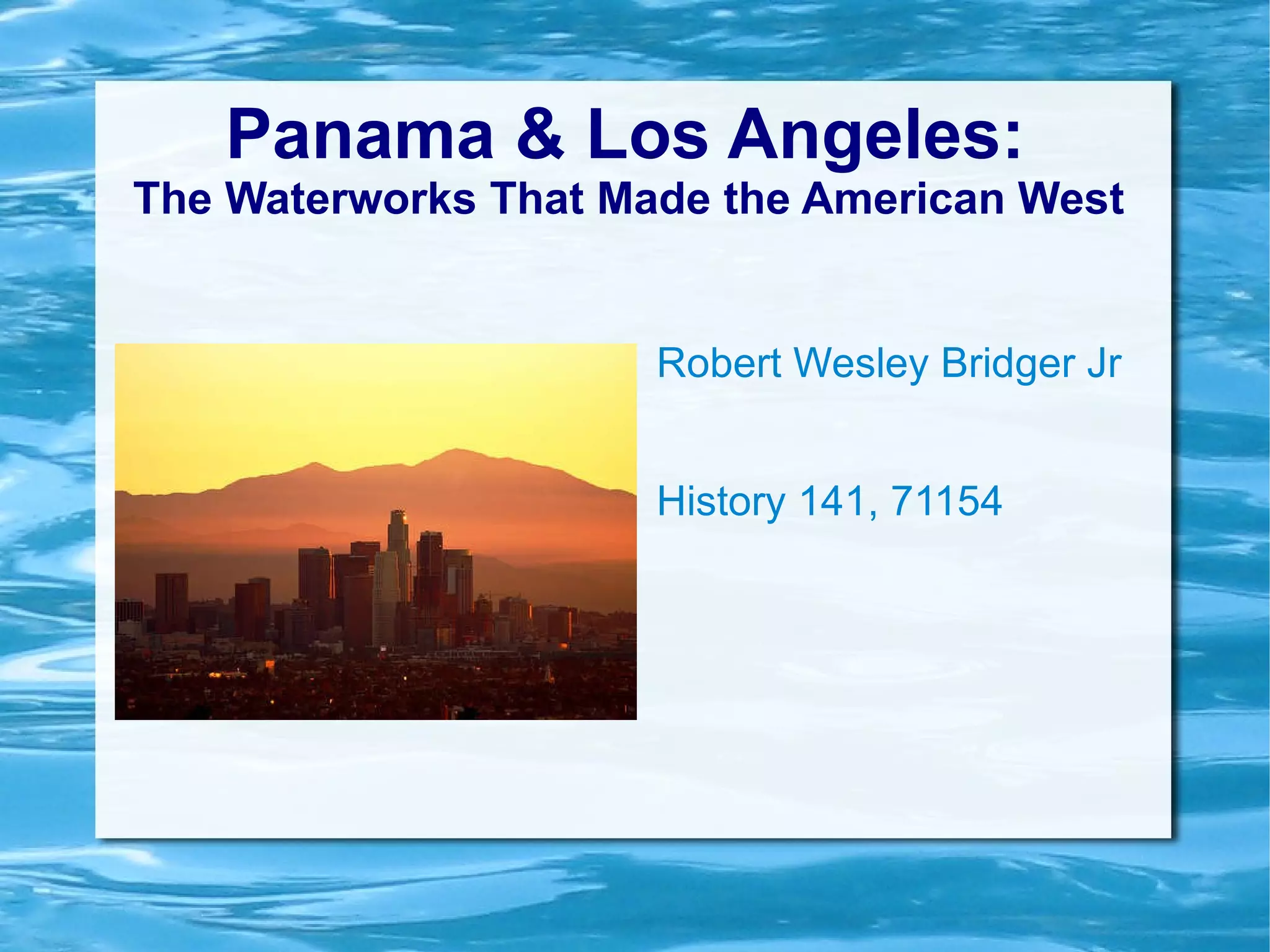 The document discusses the history of water infrastructure projects in Los Angeles and Panama. It describes how Los Angeles grew rapidly in the late 19th century due to the construction of the Los Angeles Aqueduct, which brought water from the Owens Valley over 200 miles away. It also discusses the Panama Canal project, including the prior failed French attempt and the American completion of the canal in 1914 after controlling diseases like yellow fever. Key figures discussed include William Mulholland for the Los Angeles aqueduct and William Gorgas and Theodore Roosevelt for their roles in the Panama Canal.