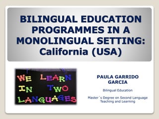 This document discusses bilingual education and bilingualism. It provides background on topics like the bilingual child, the USA, and California. California has a highly diverse population, with over 25% of children speaking a language other than English, most commonly Spanish. The document also outlines some of California's policies around bilingual education over time. It discusses two bilingual education models and provides examples of two schools implementing these models: San Fernando Elementary and Joseph Gascon Elementary. Both schools saw progress in students' English language learning through solid, consistent instruction in their bilingual programs.