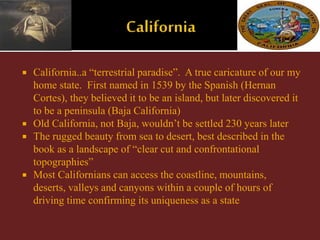 This document provides an overview of the history and geography of California. It describes how California's diverse landscape was formed by tectonic activity and features coastal areas, mountains, deserts and valleys. It discusses the native populations that lived in different regions of California and relied on resources like acorns and fish. It also outlines California's growth in the 20th century, driven by the development of agriculture, manufacturing and infrastructure like roads and bridges to connect communities throughout the state. However, it notes that California now faces financial challenges stemming from issues like spending, immigration and natural disasters.