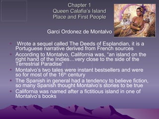 Chapter 1 discusses the origins of the name "California" from a 16th century novel, and the native peoples and geography of California prior to European contact. It describes over 100 languages spoken among 22 linguistic groups, and the lack of need for hierarchies or war due to abundant resources.