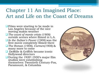 This document discusses the early history of filmmaking and photography in California. It notes that films began being made in Los Angeles in the early 1900s due to the good weather. Major film studios like Twentieth Century-Fox and Paramount established themselves in the 1920s-1930s. The document also discusses the Group f/64 photographers who sought to restore photography's purely photographic values. Additionally, it covers the musical traditions that developed in San Francisco from the gold rush era in the 1840s-1870s when it was a center for performing arts in the Far East.